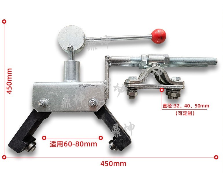 铁路接触网梯车防倾抓轨器,每台梯车配置为两个,相对于轨道对称安装于梯车两侧,可以防止梯车的倾覆。其上抱箍抱紧纵梁、主体放置距轨面至合适位置后扮动手柄旋转180°,使双钩(尼龙)抱紧铁轨。如有抱不紧或手柄不到位的现象则调整主体上方的滚花螺母即可。梯车防倾器与梯车连接处采用双重固定,使梯车更稳固。